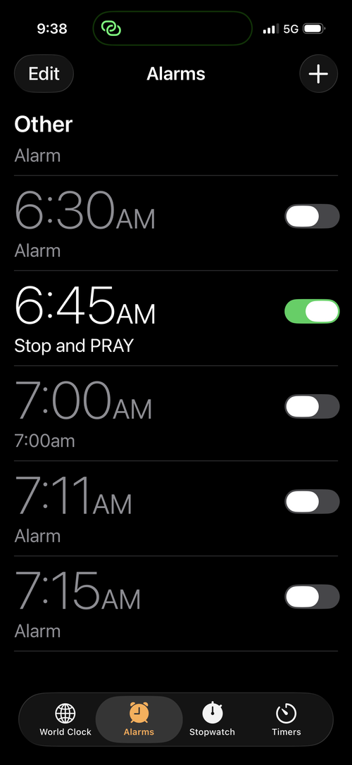 I asked them to set five alarms on their phones throughout the day. Each time the alarm sounded, we would simply pause wherever we were and pray the prayer Jesus taught His followers: “The Lord’s Prayer.” Matthew 6:9–13