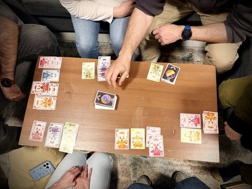 Adults playing games after a good meal around the table.